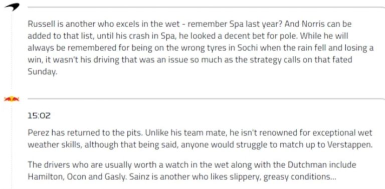 “Checo Pérez ha vuelto a boxes. A diferencia de su compañero de equipo, no es famoso por sus excepcionales habilidades en mojado, aunque dicho esto, cualquiera tendría problemas para estar a la altura de Verstappen. Los pilotos que suelen ser dignos de ver en mojado junto con el holandés son Hamilton, Ocon y Gasly. Sainz es otro al que le gustan las condiciones resbaladizas y grasientas”, escribieron.