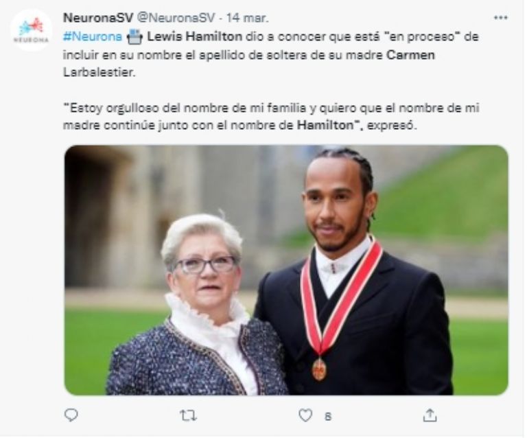 "Significaría mucho para mí, estoy muy orgulloso del apellido de mi familia (...) En realidad, ninguno de ustedes puede saber que el [apellido] de mi madre es Larbalestier. Y estoy a punto de ponerlo en mi nombre, porque realmente no entiendo completamente la idea de por qué, cuando la gente se casa, la mujer pierde su nombre", subrayó el propio Lewis Hamilton.