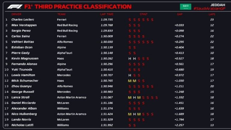 Aprovechando ese momento, de último momento, Charles Leclerc salió con su Ferrari a buscar el mejor tiempo mandó a Verstappen a la segunda posición, después de registrar 1:29.735 para quedarse con la primera posición, lo que dejó por sentado que será entre estos dos pilotos en donde se dé la lucha por el Gran Premio de Arabia Saudita y, muy probablemente, en la pelea por el título de este año en la Fórmula 1.