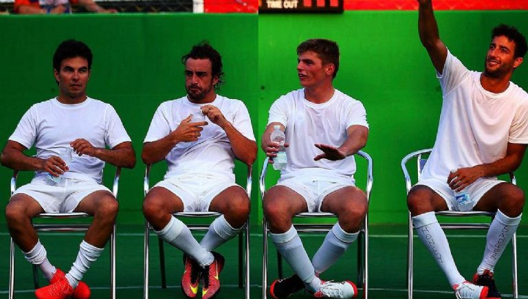 Entre los nombres de las estrellas que están vestidos con un indumentaria de futbolistas son: Checo, Max Verstappen, Daniel Ricciardo y Fernando Alonso, los cuales están sentados en una banca descansando luego de al parecer haber jugado un partido de futbol o la famosa reta.