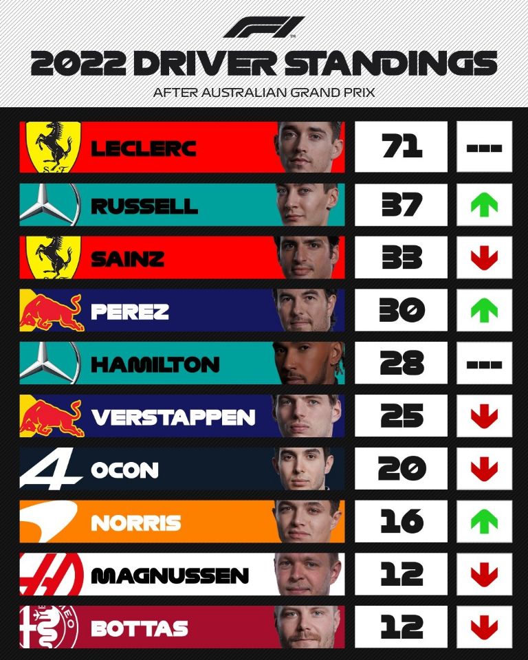 En lo que respecta a la clasificación de constructores, Ferrari sigue a la cabeza con 104 puntos, seguido de Mercedes con 65 y de Red Bull Racing con 55. La próxima carrera será en dos semanas, el próximo 24 de abril de 2022, en el Gran Premio de Emilia Romaña, a celebrarse en el Autódromo Enzo e Dino Ferrari, en Italia.