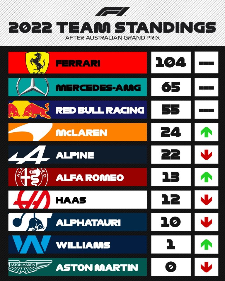 En lo que respecta a la clasificación de constructores, Ferrari sigue a la cabeza con 104 puntos, seguido de Mercedes con 65 y de Red Bull Racing con 55. La próxima carrera será en dos semanas, el próximo 24 de abril de 2022, en el Gran Premio de Emilia Romaña, a celebrarse en el Autódromo Enzo e Dino Ferrari, en Italia.