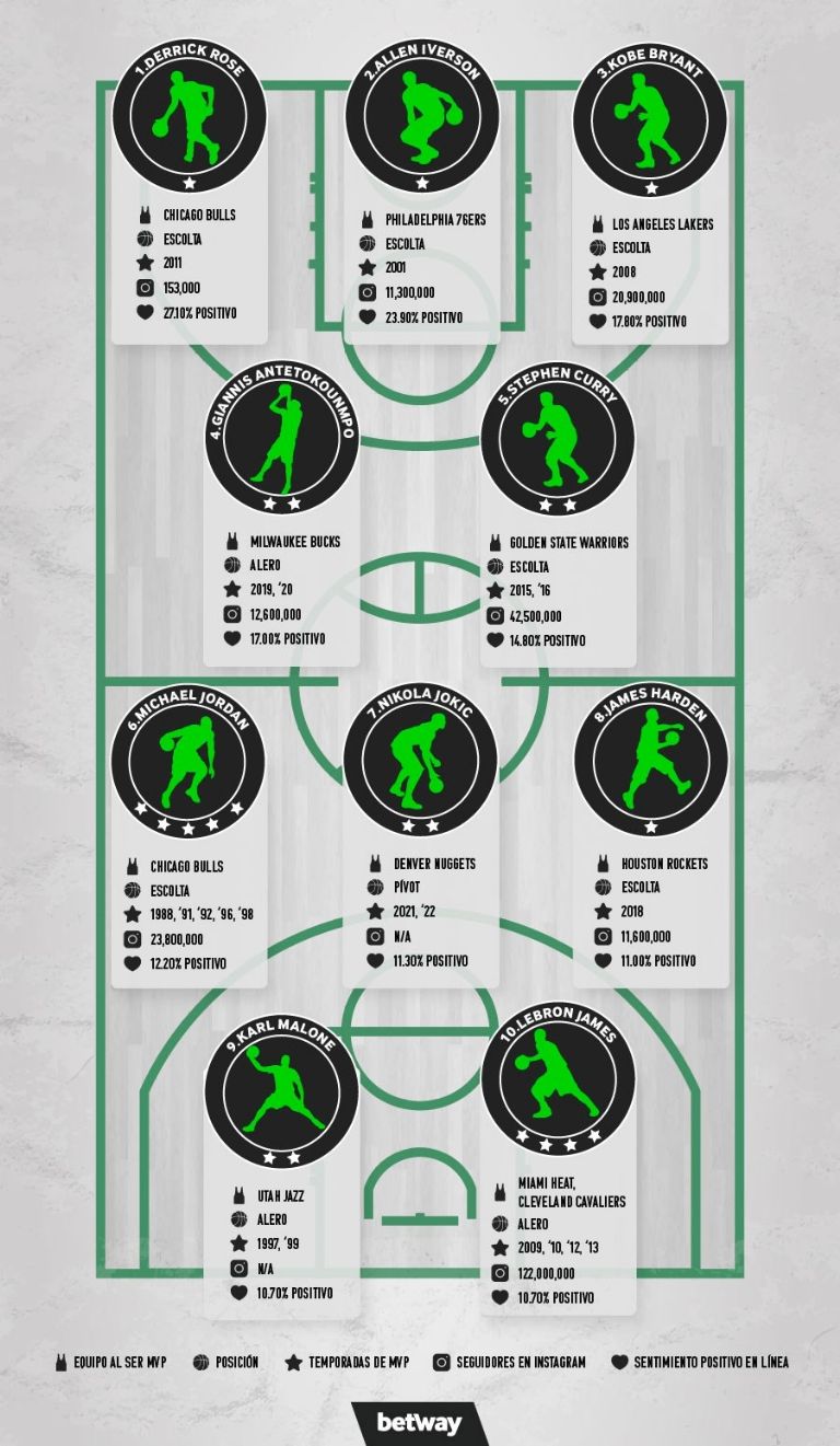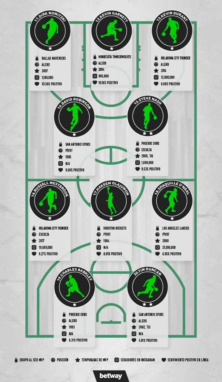 8. James Harden. Otro de los escoltas de la liga que es de los más prolíficos anotadores en la historia, ganando el reconocimiento como mejor base, así como ser considerado como uno de los mejores jugadores del mundo. Su traspaso a los Rockets de Houston hizo que se convirtiera en la piedra angular de la franquicia reciente, siendo elegido en su primera temporada para el All Star Game. Además, en 2018 fue el máximo anotador de la NBA, mismo año en conseguir el trofeo MVP. Cuenta con 11.6 millones de seguidores y su promedio de buenas sensaciones es del 11%.