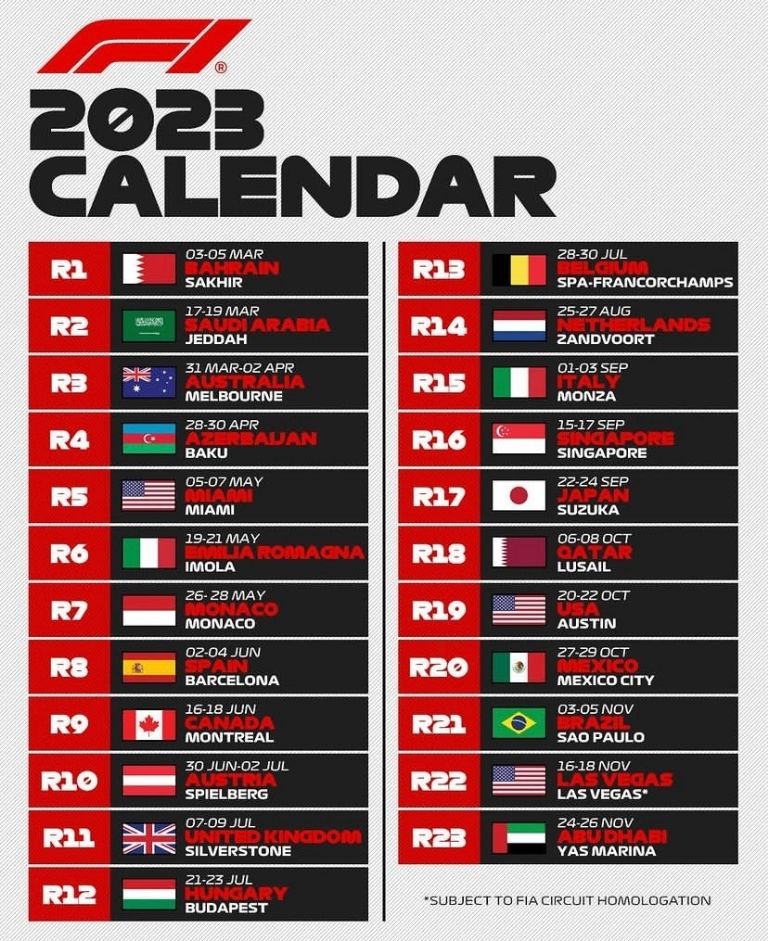Para esta nueva edición del Máximo Circuito se ha revelado que serán hasta 23 Grandes Premios los que se llevarán a cabo durante todas las fechas del 2023, los cuales se festejarán del mes de marzo a noviembre.