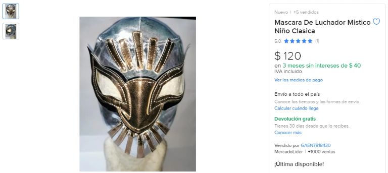 Hacerte de una máscara de Místico, en Mercado Libre, dependerá de 2 aspectos: el presupuesto que ostentas y la calidad de material que buscas. Contempla que ninguno de estos diseños, que aparecen en Internet, fue autorizado por el atleta. La careta más barata disponible ronda los 120 pesos; corresponde a su diseño clásico, del Rey de Plata y Oro, y es para niños.