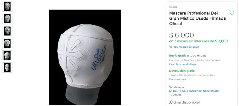 También es posible encontrar una de licra, con aplicaciones en vinil, por 148 pesos. ¿Quieres algo mucho más cercano a la máscara que utilizará Místico en AEW? Los modelos semiprofesionales van de 590 a mil 200 pesos; los profesionales, entre 2 mil 400 y 5 mil pesos. Sin embargo, el más caro vale 6 mil pesos; su propietario asegura que el deportista la usó en el ring y la firmó.