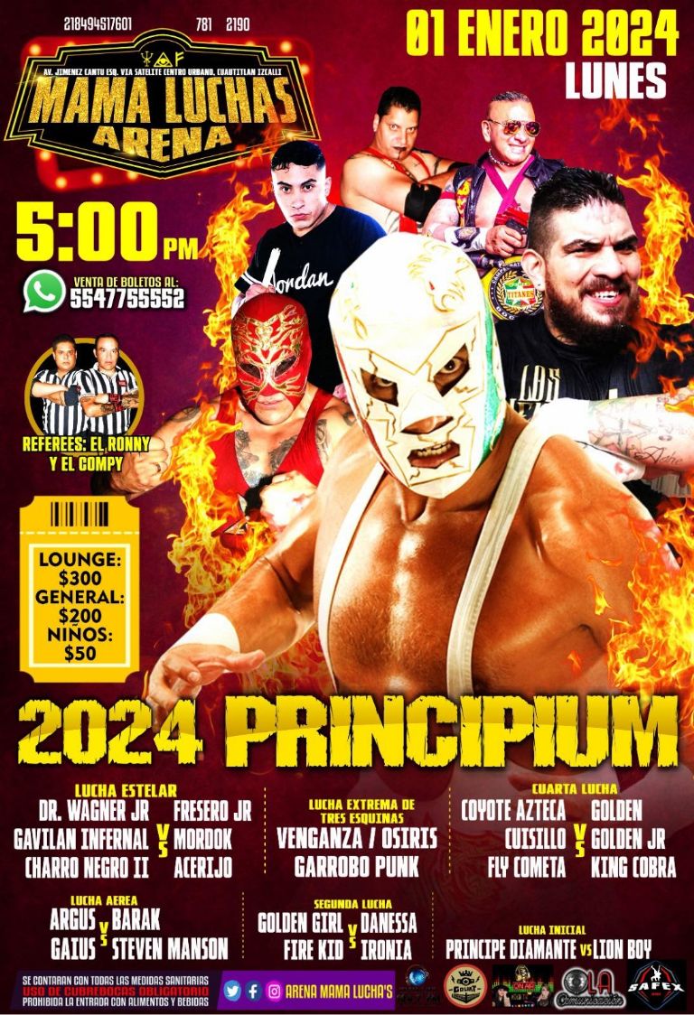- Arena Mamá Luchas: En Cuautitlán Izcalli, a las 17:00 horas, la lucha libre afrontará Principium. En el platillo estelar, relucirá Dr. Wagner Jr. El Galeno del Mal estará acompañado por Gavilán Infernal y Charro Negro II para medirse a Fresero Jr, Mordok y Acertijo.