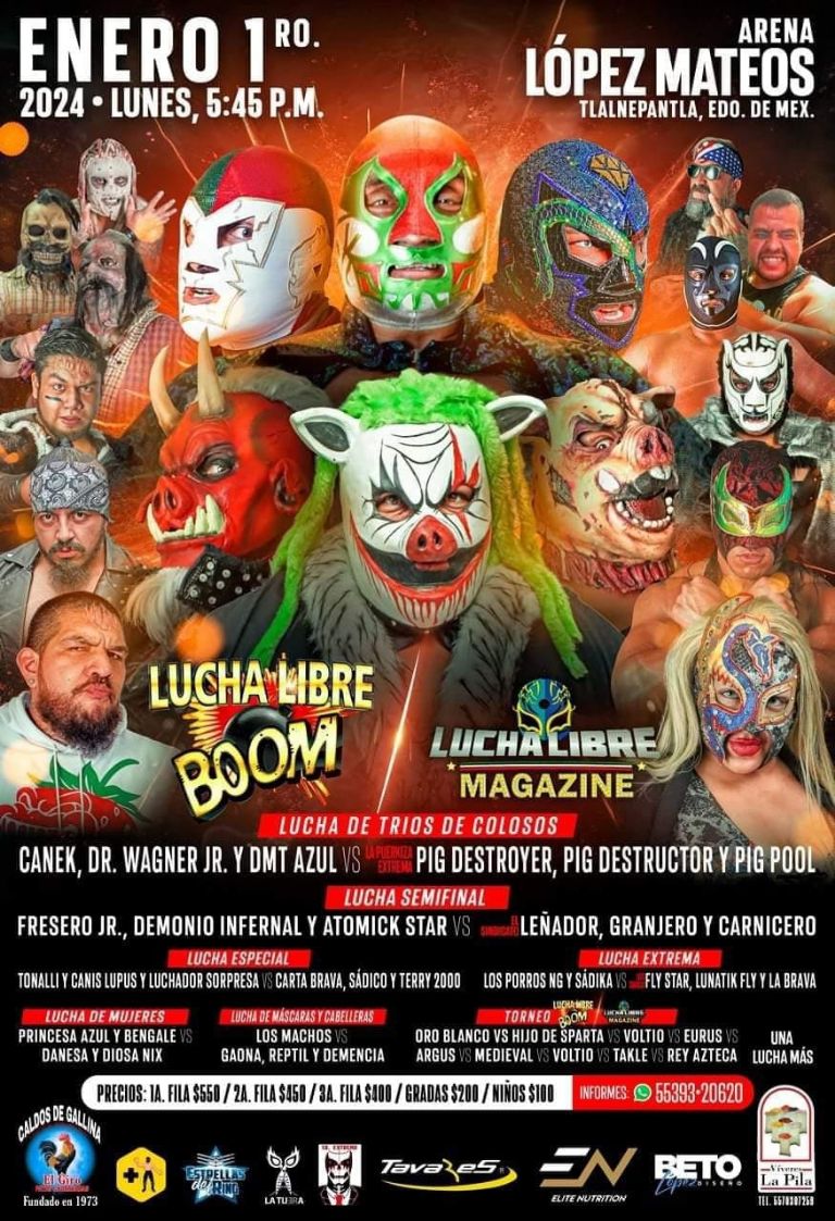 - Arena López Mateos: En Tlalnepantla, a las 17:45 horas, Lucha Libre Boom tendrá un trío de colosos. El lunes 1 de enero de 2024, Dr. Wagner Jr. sostendrá su segundo encuentro del día: junto a la leyenda Canek y DMT Azul se verá las caras ante La Puerquiza (Pig Destroyer, Pig Destructor y Pig Pool).