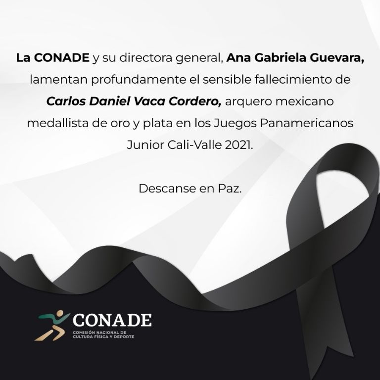 La Comisión Nacional de Cultura Física y de Deporte (Conade) fue la que anunció el fallecimiento de Carlos Vaca, con su titular Ana Gabriela Guevara lamentando la partida de la joven promesa en tiro con arco que ya había ganado varias medallas y cuyo fallecimiento también sintieron las deportistas Aída Román, Valentina Vázquez y Andrea Becerra en sus redes sociales.