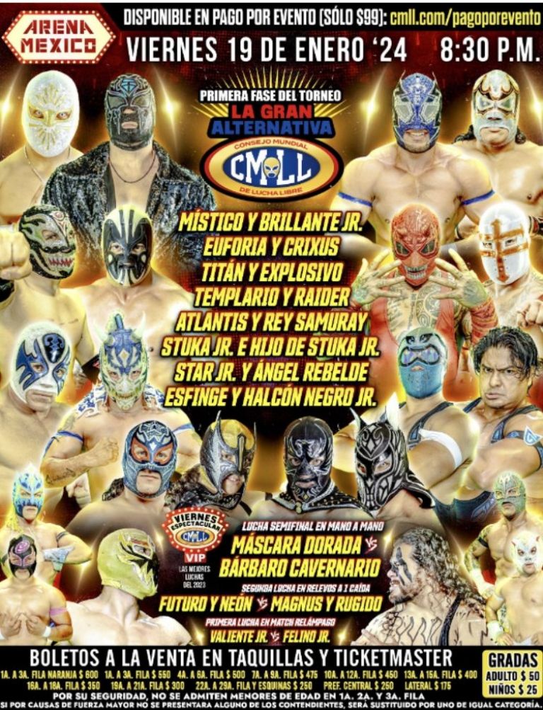 - Primera fase del torneo “La Gran Alternativa” donde participarán: Místico y Brillante Jr.; Euforia y Crixus; Titán y Explosivo; Templario y Raider; Atlantis y Rey Samuray; Stuka Jr. e Hijo de Stuka Jr.; Star Jr. y Junior Rebelde; Esfinge y Halcón Negro Jr.