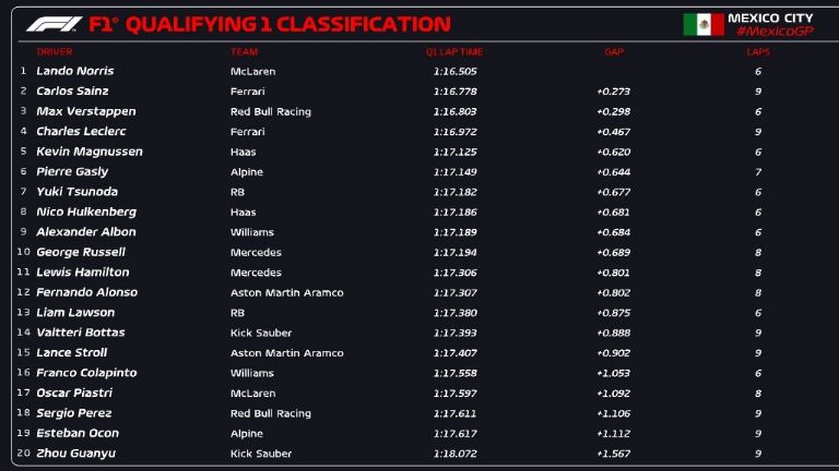 En su primera salida Checo Pérez puso tiempo de 1:18.530 minutos para ubicarse en la séptima posición de la Q1 en el Autódromo Hermanos Rodríguez, mientras que Lando Norris encabezaba la clasificación con 1:17.203 minutos, el tetracampeón neerlandés Max Verstappen tomaba la punta de la arrancada del GP de México con 1:16.998.
