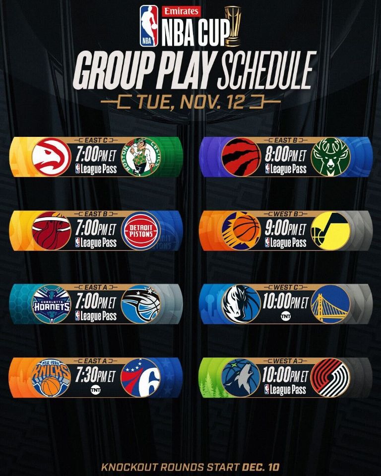 Con los partidos Detroit Pistons vs Miami Heat, Boston Celtics vs Atlanta Hawks, Orlando Magic vs Charlotte Hornets, Philadelphia 76ers vs New York Knicks, Milwaukee Bucks vs Toronto Raptors y Utah Jazz vs Phoenix Suns dará inicio este martes 12 de noviembre la Emirates NBA Cup, que el año pasado repartió premios por 500 mil dólares a cada uno de los jugadores de Los Angeles Lakers por ganar el título, 200 mil a los de Indiana Pacers por ser subcampeón y 100 mil billetes verdes a los de Pelicans y Bucks por llegar a las semifinales.