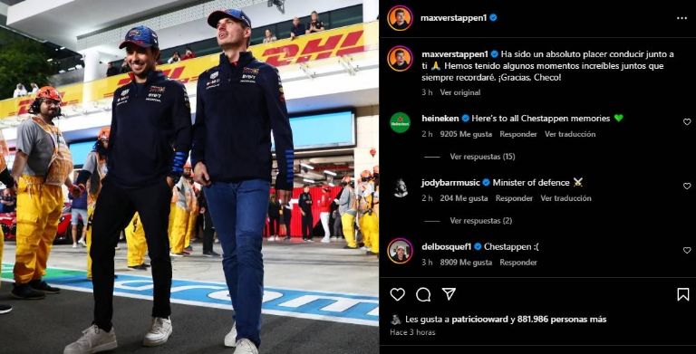 “Ha sido un absoluto placer conducir a tu lado. Hemos tenido algunos momentos increíbles y siempre lo recordaré. Gracias Checo”, escribió Verstappen