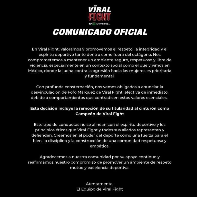 “Con profunda consternación, nos vemos obligados a anunciar la desvinculación de Fofo Márquez de Viral Fight, efectiva de inmediato, debido a comportamientos que contradicen estos valores esenciales. Esta persona queda totalmente desvinculada del evento y su título se le será retirado”, concluyó Viral Fight.