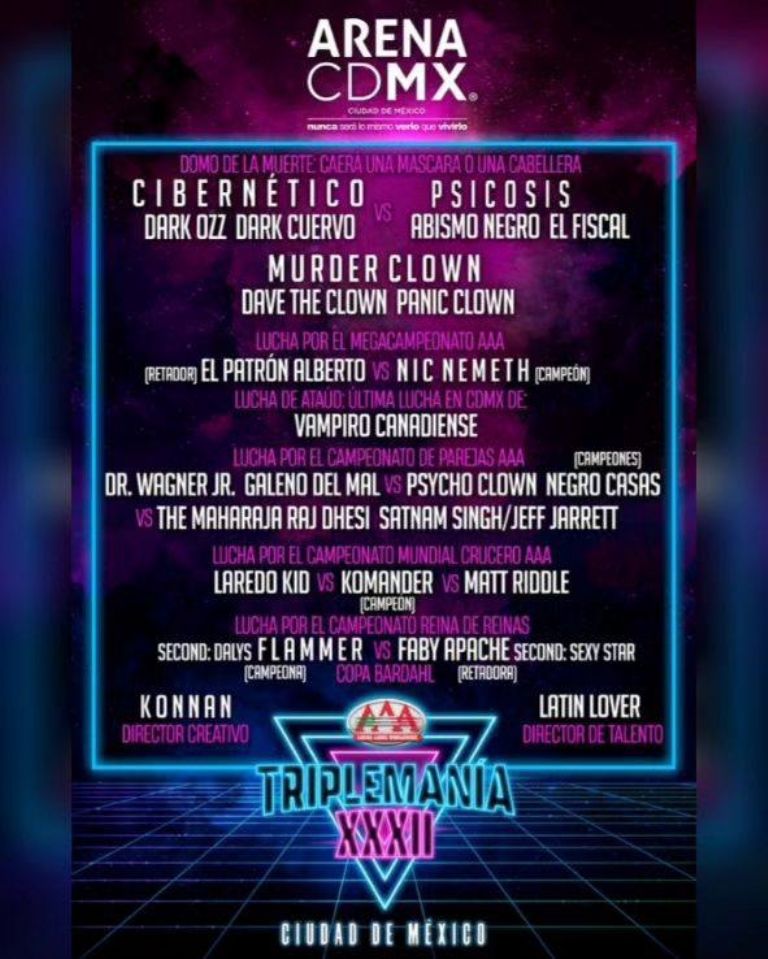 Se acerca la edición número 32 de Triplemanía y promete una velada llena de peleas en la CDMX. En la función habrá grandes figuras como Psycho Clown, Cibernético y el mítico Vampiro Canadiense le pondrá punto final a su carrera en el pancracio. Sin duda será una noche histórica en la lucha libre de la AAA. Aquí te dejamos todo lo que debes saber sobre esta espectacular jornada, desde la fecha, el precio de los boletos y la cartelera completa.