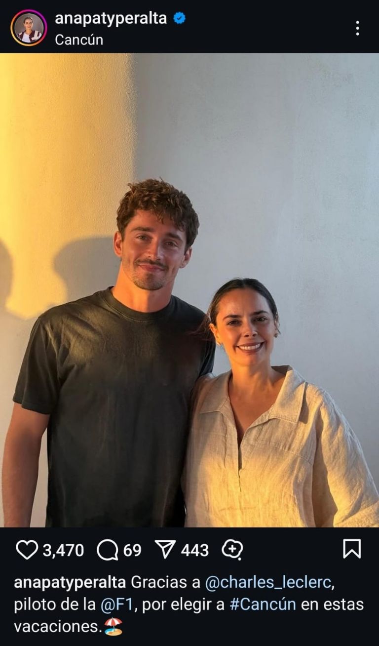 Ana Paty Peralta subió la foto a su cuenta de Instagram con el mensaje “Gracias a @charles_leclerc, piloto de la @f1, por elegir a #Cancun en estas vacaciones. Siempre serás bienvenido a nuestra casa y mucho éxito en la temporada 2025 ¡Te deseamos lo mejor!”. La publicación se convirtió en la más popular de la mandataria, en cuestión de horas superó los 3 mil me gusta, 400 compartidos y 50 comentarios.