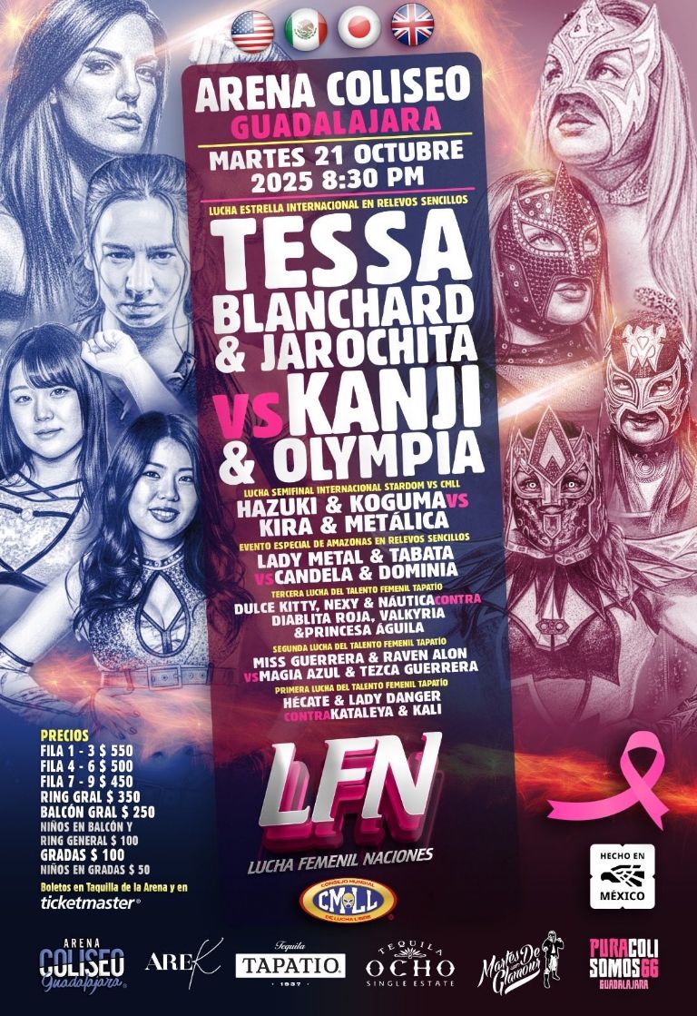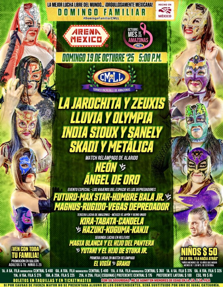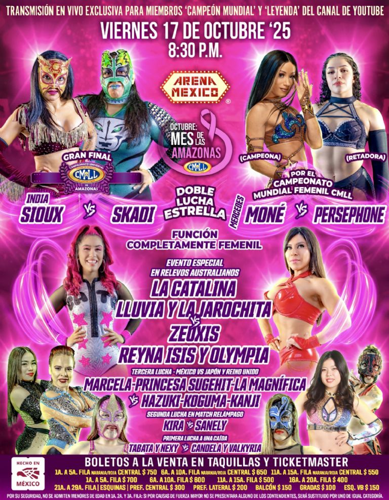 Pero la "México-Catedral" y "El Embudo de la Lagunilla" de Ciudad de México, "El templo del dolor" de Puebla y la Arena Coliseo de Occidente en Guadalajara recibirán a múltiples gladiadoras nacionales y extranjeras: con tal de mantener intacto el realce de las mujeres previo al Grand Prix de Amazonas 2025, del viernes 24 de octubre.