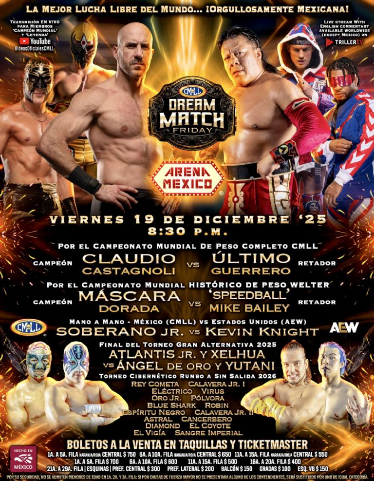 Claudio Castagnoli, "Speedball" Mike Bailey y Kevin Knight regresarán al Consejo Mundial de Lucha Libre (CMLL), directamente desde la compañía estadounidense All Elite Wrestling (AEW), para afrontar 3 luchas de ensueño ante Último Guerrero, Máscara Dorada y Soberano Jr: como parte de las carteleras del 19 al 21 de diciembre.