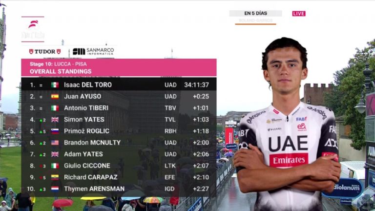 Isaac del Toro sigue haciendo historia en el Giro de Italia. El mexicano conservó el maillot rosa tras completar la décima etapa de la competencia, una contrarreloj individual entre Lucca y Pisa marcada por la lluvia y la estrategia. El ciclista, de 21 años, e integrante del UAE Team Emirates, mantiene el liderato general, aunque con una diferencia más ajustada.