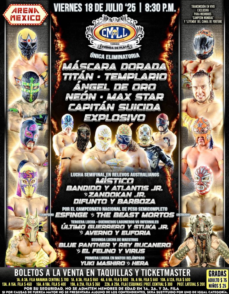 Este 18 de julio de 2025, el CMLL comenzará con su actividad en la Arena México: en que 8 luchadores competirán para definir a los dos finalistas del Torneo La Leyenda de Plata 2025. Nombres como Capitán Suicida, Explosivo, Neón y Max Star buscan robarse los reflectores ante los consagrados Máscara Dorada, Titán, Templario y Ángel de Oro.