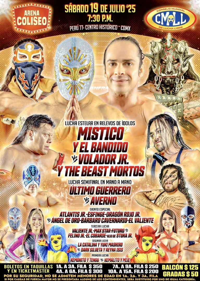 CMLL contará con Místico, Bandido y The Beast Mortos en sus CARTELERAS del 18 al 21 de julio