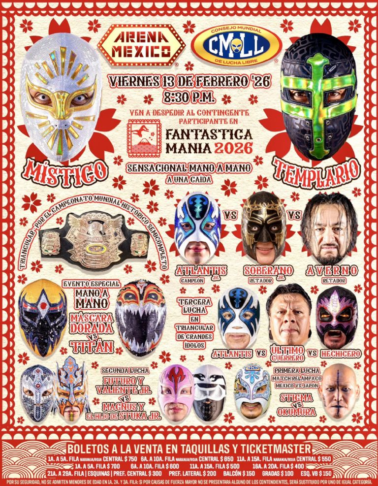 Durante el Viernes Espectacular del 13 de febrero, la Arena México verá un mano a mano entre Místico y Templario; tal como una nueva defensa titular del Campeonato Mundial Histórico Semicompleto, en que Atlantis Jr. chocará ante Soberano Jr. y Averno. En suma, contará con todo el talento que viajará a Japón para afrontar la gira con New Japan Pro Wrestling (NJPW).