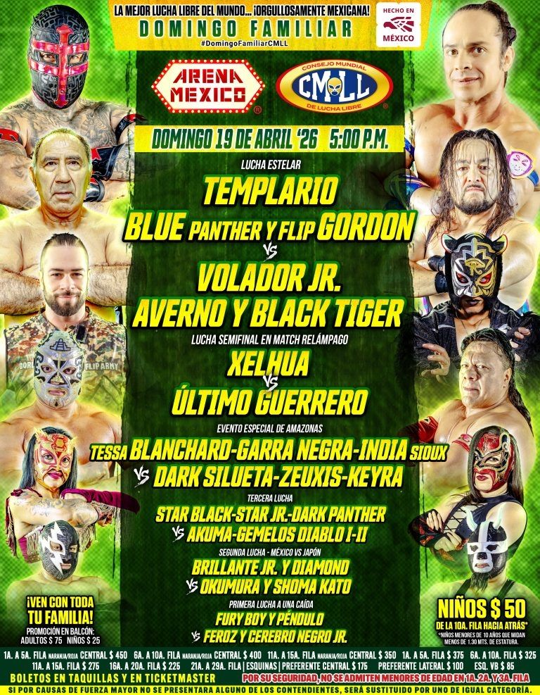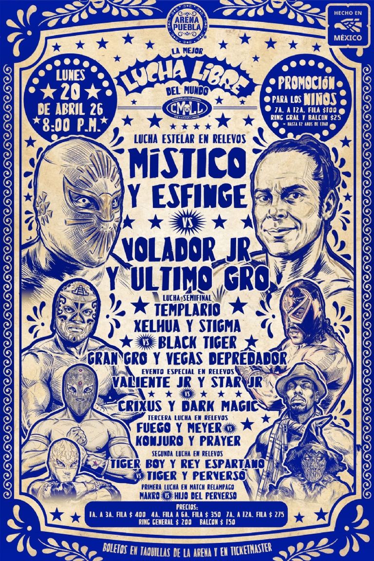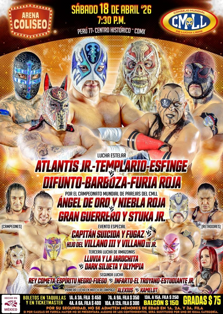 Mientras que entre el sábado 18 y el lunes 20 de abril, la actividad se trasladará a la Arena Coliseo y la México-Catedral de CDMX, tal como al Templo del Dolor en Puebla. Los Hermanos Chávez, El Galeón Fantasma, Blue Panther, Xelhua, Tessa Blanchard, Místico, Esfinge y Volador Jr. serán ciertos gladiadores que participarán en los shows.