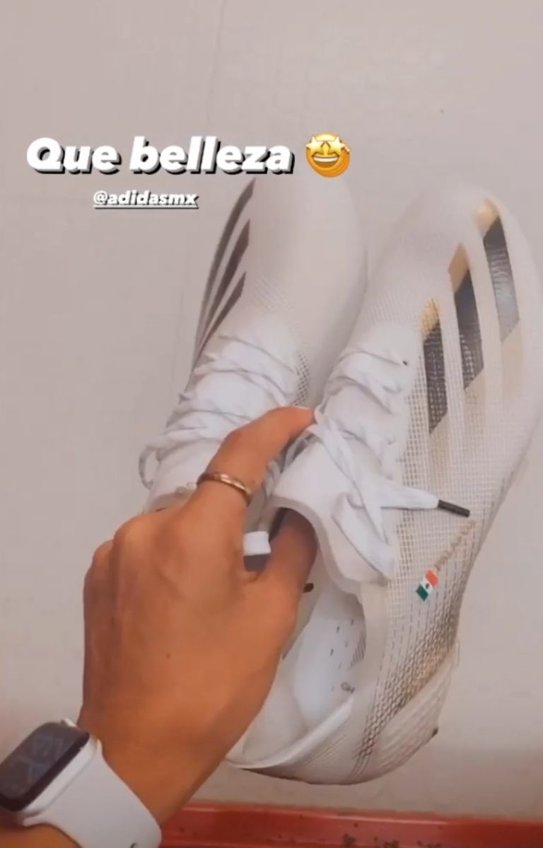 "Qué belleza", fue la descripción que usó la jugadora nacida en Sonora para sus nuevos botines, los cuales son de la marca Adidas, en color blanco y lucen vivos en dorado y negro, además de la tradicional bandera de México, en un costado.