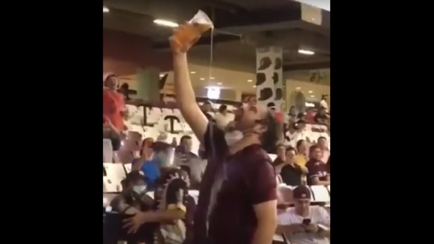 Durante el partido se pudo ver a un aficionado bañarse en cerveza y bailando, aparentemente bajo los influjos del alcohol, pero no sólo es deplorable espectáculo se presenció en las tribunas.