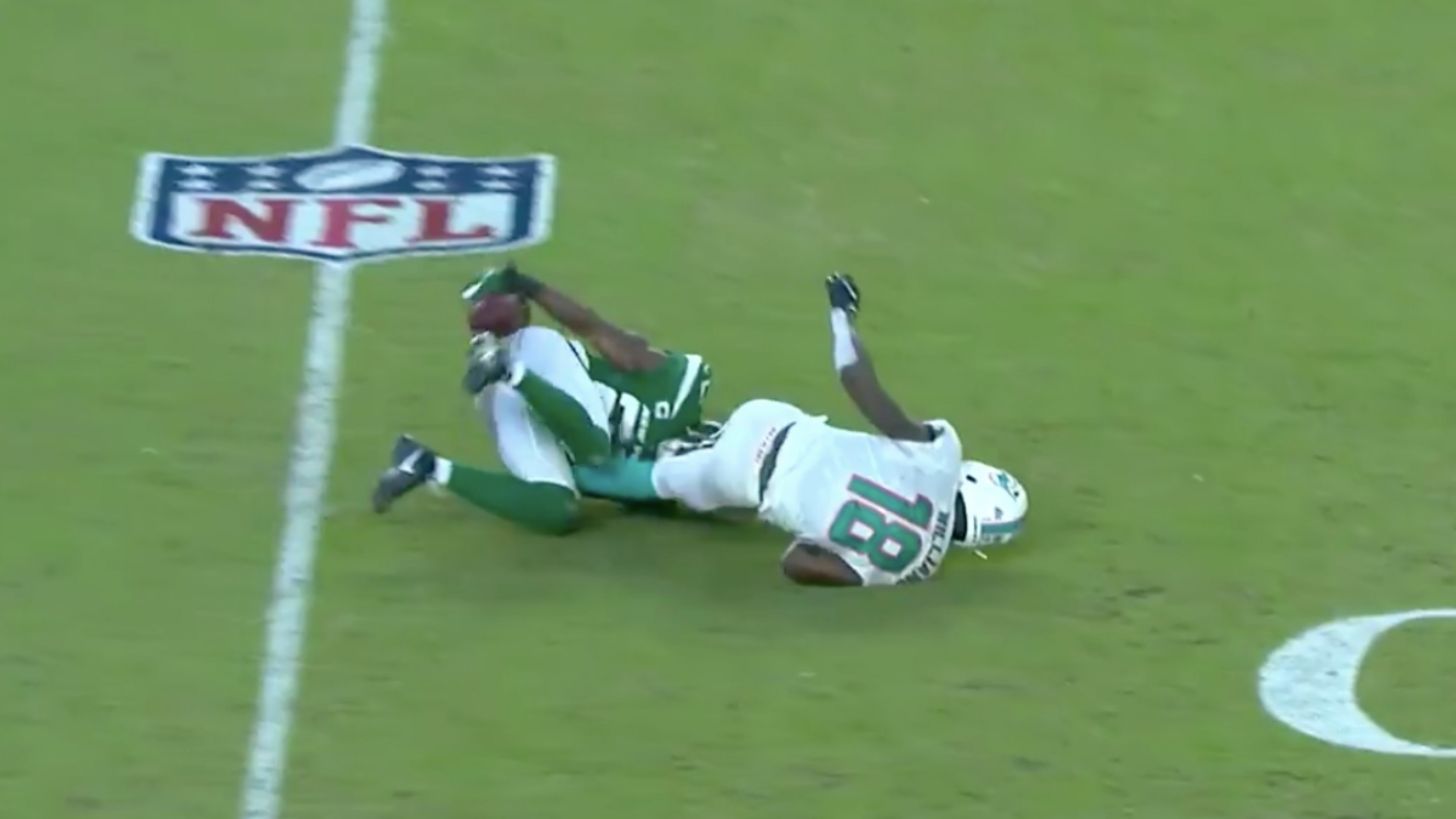 En el encuentro ante los Miami Dolphins, con desventaja de 0-24 en el marcador y en el último cuarto, los Jets robaron suspiros con una de las jugadas defensivas más espectaculares en lo que va de este certamen.