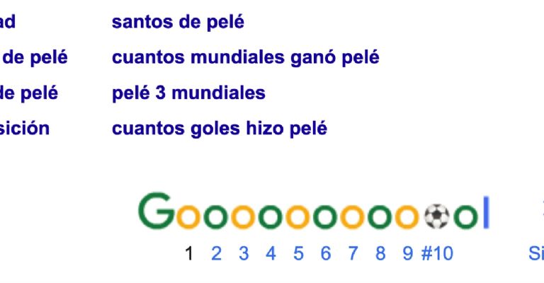 Al realizar una búsqueda con la palabra Pelé en Google, al final de la página de resultados se puede ver un Doodle animado en honor al Rey Pelé, para poder verla, se debe hacer clic en el #10.