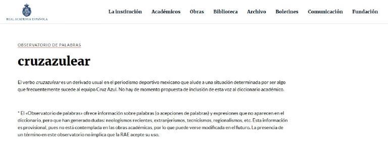 Tan famoso es este término 'cruzazulear' que la Real Academia Española (RAE) lo incluyó en su Observatorio de palabras, aunque todavía no tiene apuntado agregarlo a su diccionario oficial, al menos por ahora.