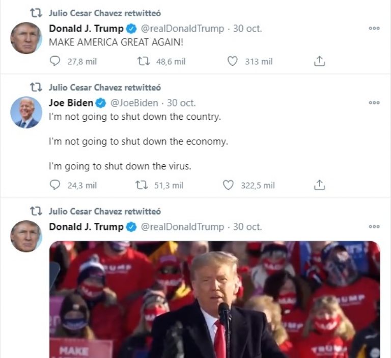 Mientras en uno del candidato opositor Joe Biden, también mostró su apoyo, dejando en claro la indecisión de Chávez Jr. en las elecciones de Estados Unidos.