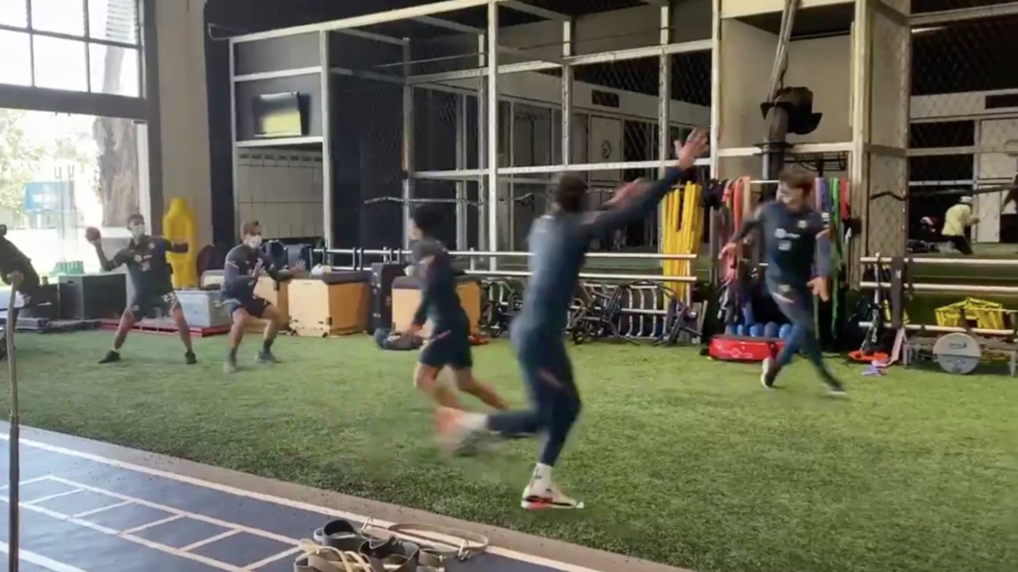 En un video compartido en redes sociales, el portero Óscar Jiménez mostró la coordinación de sus compañeros para conseguir un touchdown sobre el pasto sintético del gimnasio, donde normalmente realizan ejercicios de fuerza y acondicionamiento físico.