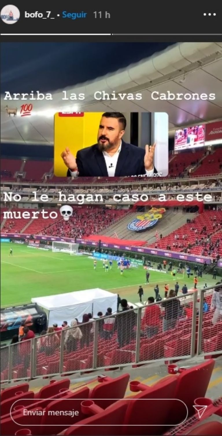 A través de sus Instagram Stories, pidió a sus seguidores no le hagan caso a morales: "Arriba las Chivas cabrones. No le hagan caso a este muerto", escribió, mientras filmaba la grabación del festejo tapatío.