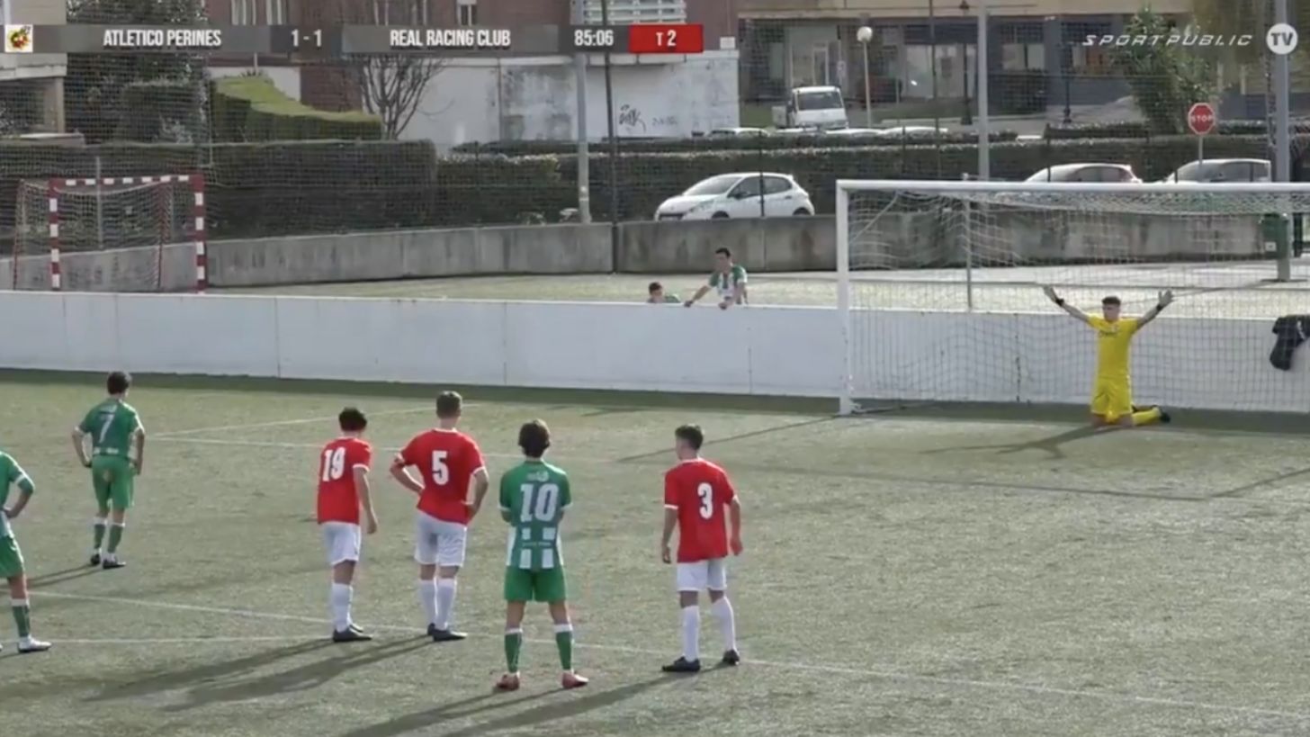 Álvaro Jiménez es un portero juvenil de la División de Honor del Racing de Santander. En uno de sus últimos partidos, contra el Atlético Perines, el guardameta puso en práctica la estrategia que utiliza para atajar penales: de rodillas sobre la línea y con los brazos en cruz.