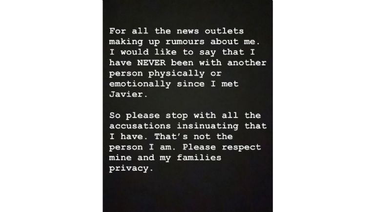 "Para todos los medios de comunicación que inventan rumores sobre mí. Me gustaría decir que NUNCA he estado con otra persona física o emocionalmente desde que conocí a Javier", escribió.