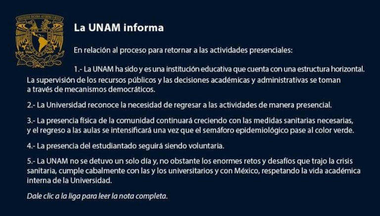 A través de un comunicado, la UNAM reconoció "la necesidad de regresar a las actividades de manera presencial” y señaló que así ha sido desde hace semanas en aquellas escuelas y facultades que lo decidieron.