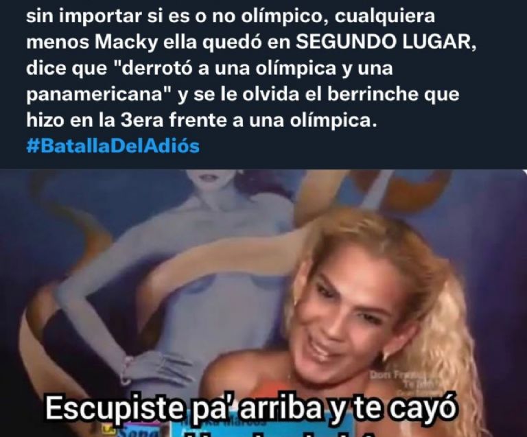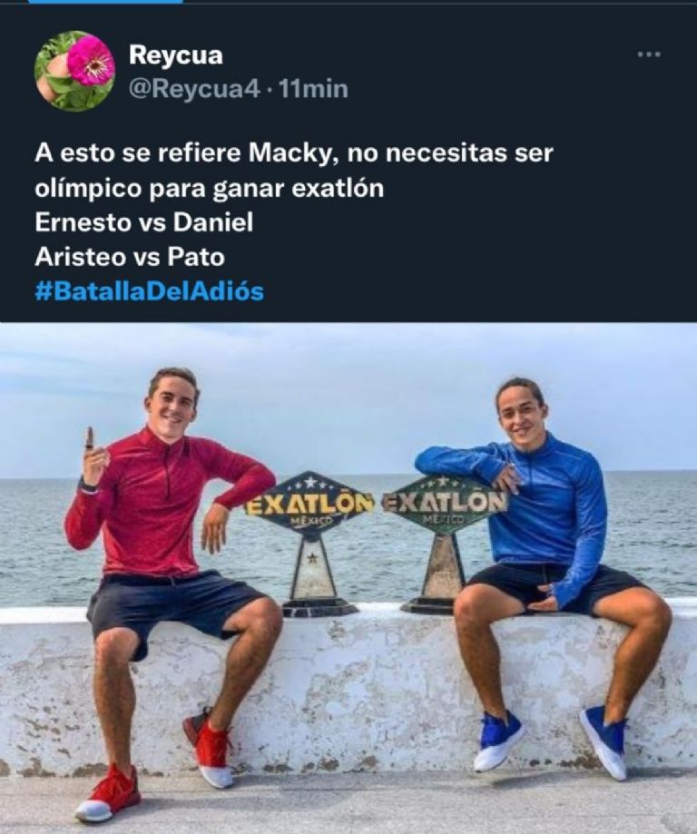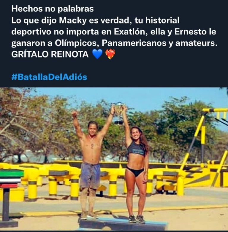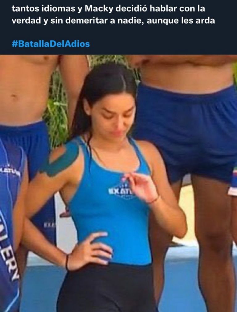 Por lo que Macky le recordó que ella le ha ganado a ese tipo de atletas y que ser participante del Exatlón México los convierte automáticamente en deportistas de alto rendimiento, también le reveló que no importa si eres atleta olímpico o no, estar en el Exatlón es una disciplina que exige mucho de sus participantes.