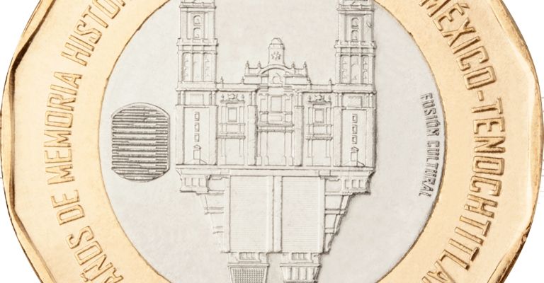 La moneda más interesante es la que tiene la leyenda “500 años de memoria histórica de México-Tenochtitlan”, pues posee una interesante composición: desde un ángulo se puede ver la Catedral de la Ciudad de México y desde otro se aprecia al Templo Mayor, como si fuera una especie de reflejo.