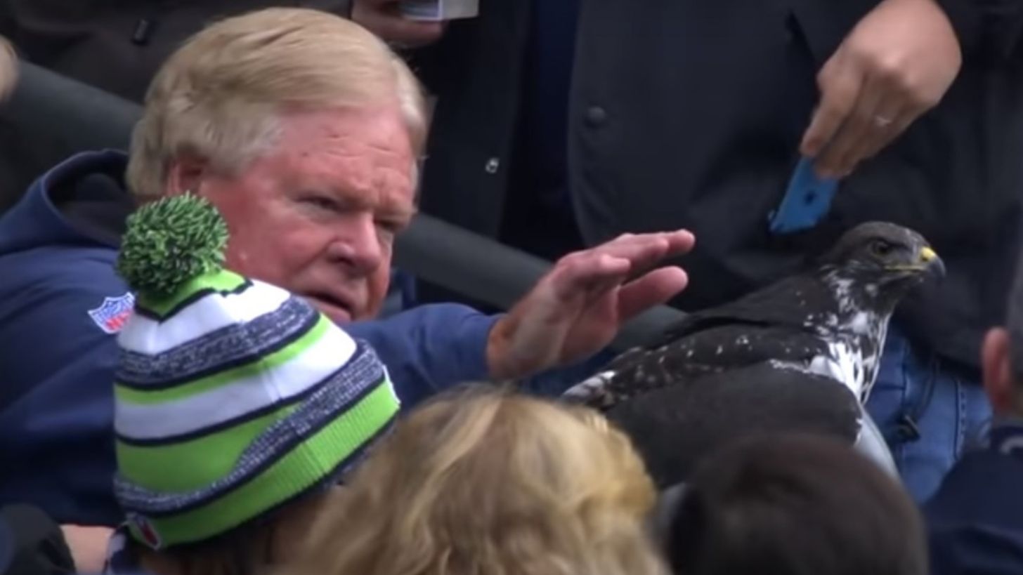 El momento curioso en el duelo de la Semana 5 de la National Football League fue captado por las cámaras de televisión, luego de que al finalizar el primer cuarto del partido el staff de entretenimiento del equipo dejó que la ave volara libremente por el Lumen Field, aunque cuando se terminó el acto y fue llamado para volver a su cautiverio el animalito decidió no hacerle caso a su entrenador y buscar refugio en el pelo cano de un hombre de la tercera edad.