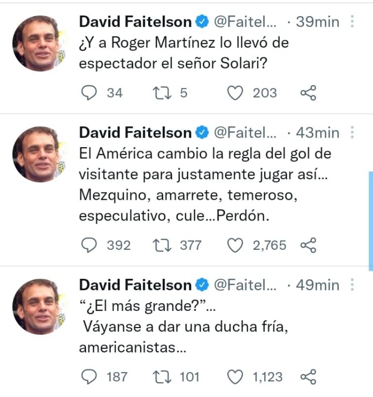 Como era de esperarse, las publicaciones de David Faitelson trajeron consigo un sinfín de comentarios en su red social favorita. Algunos usuarios mostraron su apoyo hacia este tachando al América de un club “ratonero”; no obstante, hubo otro sector que lo cuestionó indicando que la Liguilla en México debe jugarse de la manera que planteó Solari, mismo que buscará terminar con la llave este sábado en el Azteca a las 19:00 horas.