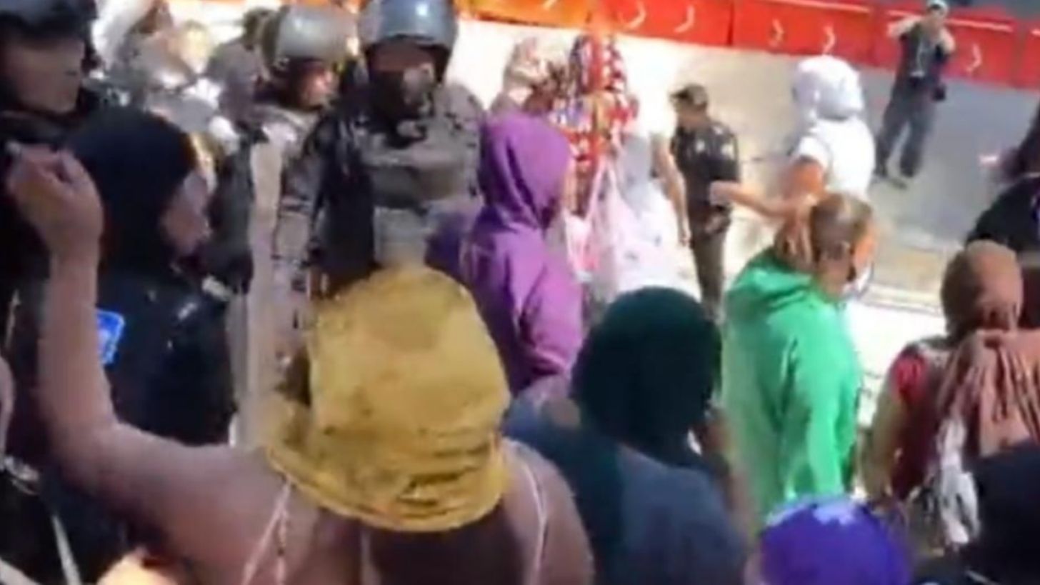 ¡Lo golpearon, eh! Lo golpearon", se escucha que grita una las integrantes del mencionado grupo, denunciando la resistencia que ponían elementos de seguridad para evitar que siguieran subiendo la escalinata del Ángel de la Independencia.