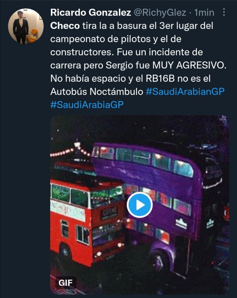 Sergio Pérez tuvo que abandonar el Gran Premio de Arabia Saudita después de ser impactado por Charles Leclerc, piloto de Ferrari, por lo que luce casi imposible que pueda terminar en la tercera posición en la temporada de Fórmula Uno. Los memes no se hacen esperar tras la situación.