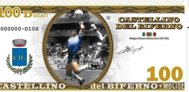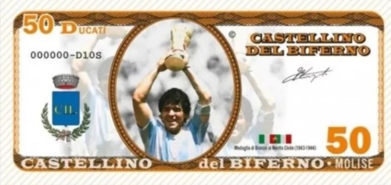 Monedas y billetes con la imagen de Diego Maradona empezaron a circular en Castellino del Biferno, un pueblo de Molise, en la provincia italiana de Campobasso, con valor oficial y en homenaje al legendario capitán de la selección argentina. La idea que surgió inicialmente en Argentina, con un proyecto de ley, finalmente se cristalizó en el país que vio a Diego campeón con el Napoli.