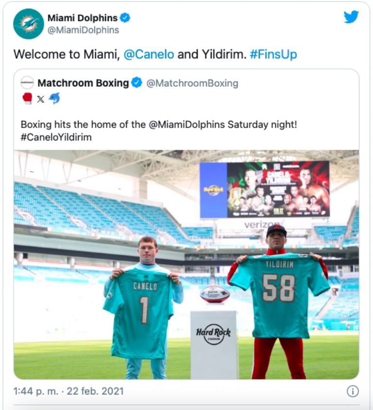 A través de redes sociales, los Dolphins le dieron la bienvenida al peleador mexicano y compartieron el encuentro que tuvo con Yildirim en su estadio, con jerseys personalizados del equipo: Canelo, con el número 1; mientras que el retador turco con el número 58.