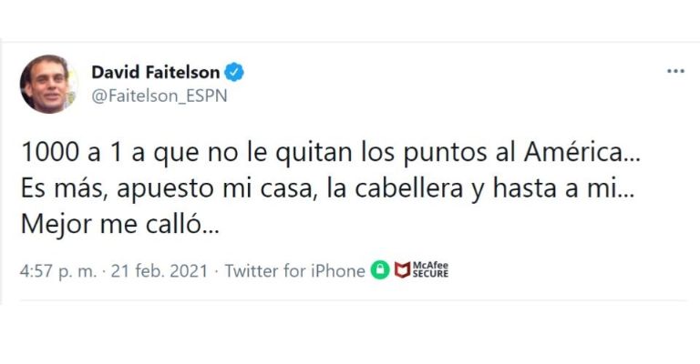 Se espera que en próximas horas se de a conocer una postura oficial de la Liga MX o, en su defecto, un castigo al equipo por dicha situación, lo que David Faitelson considera que no pasará por alguna razón puesta sobre la mesa de forma discreta por el antiamericanista.