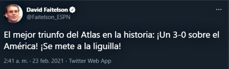 Sin embargo, Faitelson también recurrió a la ironía para felicitar al Atlas por haber ganado los tres puntos. "El mejor triunfo del Atlas en la historia: ¡Un 3-0 sobre el América! ¡Se mete a la liguilla!", afirmó.