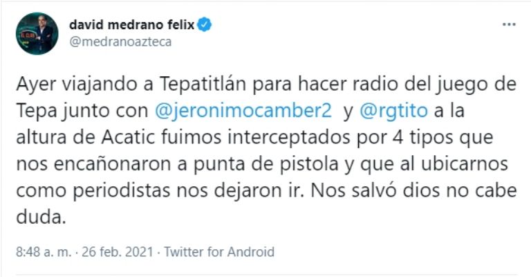 Cuando se dirigía al municipio de Tepatitlán en la zona conurbada de Guadalajara, para la transmisión de un partido de la Liga Expansión MX, le apuntaron con una pistola.