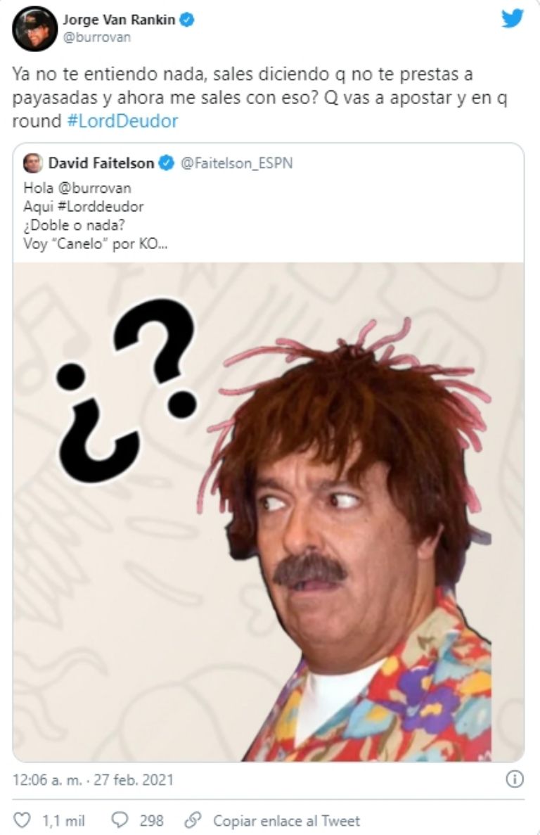 “Hola Burro Van Rankin. Aquí Lord Deudor; ¿Doble o nada? Voy “Canelo” por KO…” lanzó Faitelson, “Ya no te entiendo nada, sales diciendo q no te prestas a payasadas y ahora me sales con eso? Q vas a apostar y en qué round”, respondió Van Rankin.